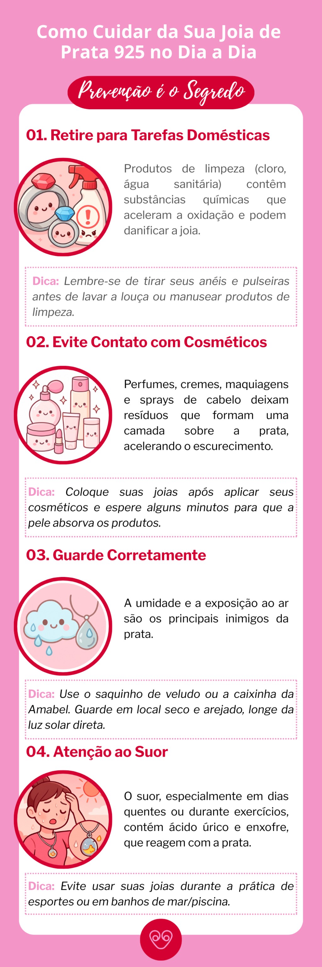 | Guarde Corretamente | A umidade e a exposição ao ar são os principais inimigos da prata. | Use o saquinho de veludo ou a caixinha da Amabel. Guarde em local seco e arejado, longe da luz solar direta. |